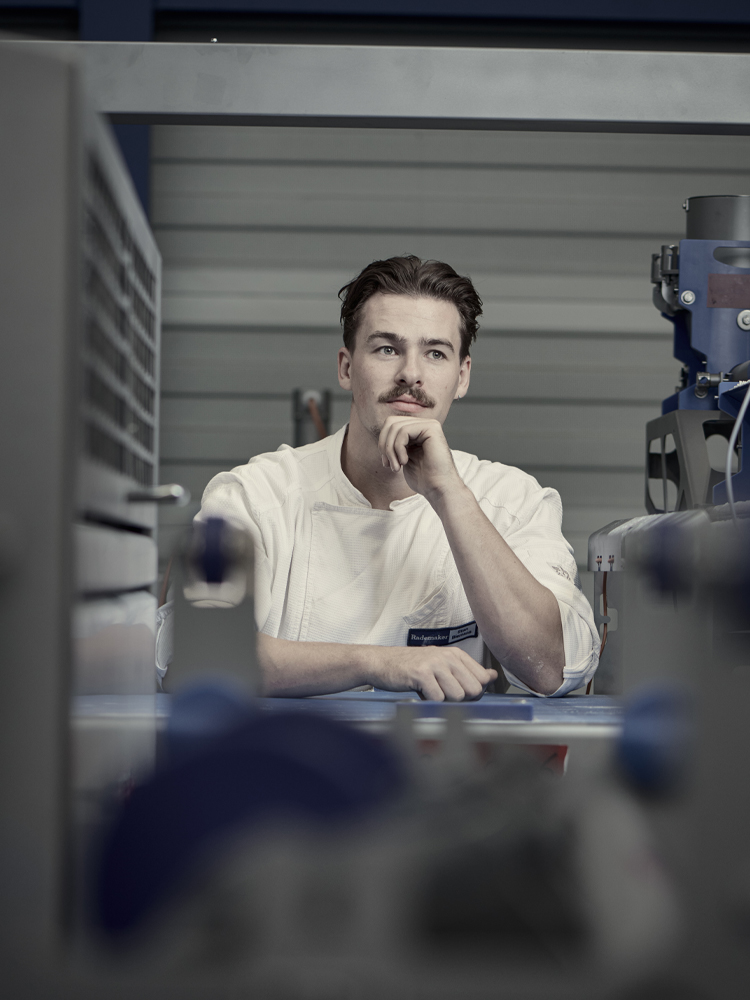 ‘In het Technology Centre testen we hoe we klantproducten op onze lijnen kunnen maken. Ik heb altijd al iets gehad met voedingsmiddelentechnologie. Na mijn bakkerijopleiding studeerde ik Food Technology aan de HAS. Wat voor de consument een simpel product lijkt, is in werkelijkheid het resultaat van veel denkwerk, testen en techniek achter de schermen. We innoveren en leren continu.